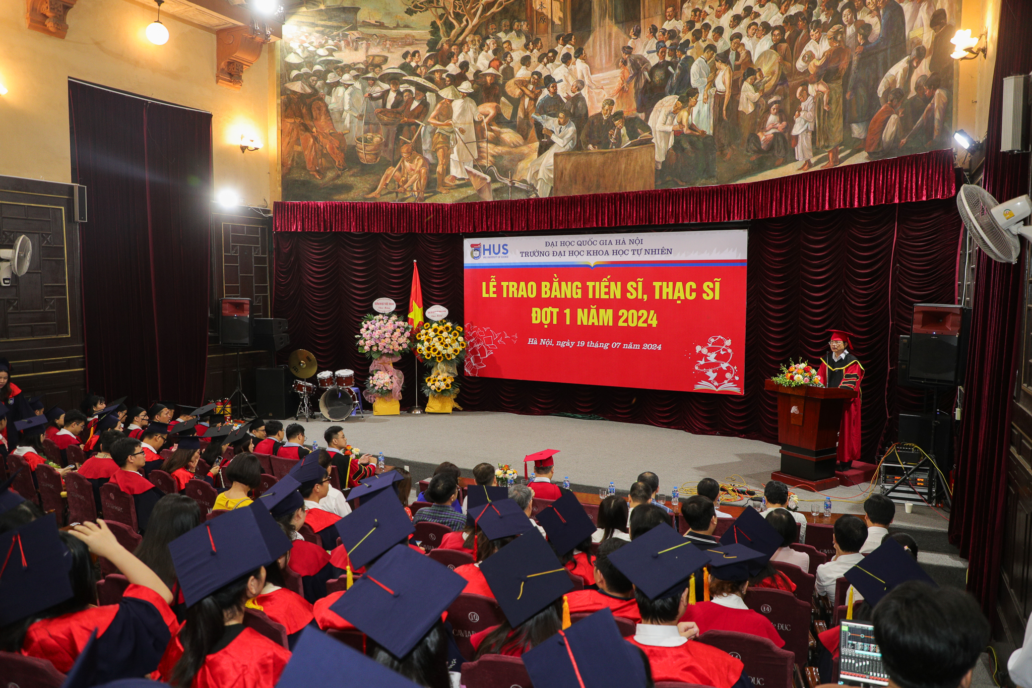Phát biểu tại Lễ trao bằng, Hiệu trưởng Trường ĐH Khoa học Tự nhiên GS.TSKH Vũ Hoàng Linh đã chúc mừng thành công tới các tân tiến sĩ, thạc sĩ tốt nghiệp. GS.TSKH Vũ Hoàng Linh bày tỏ cùng các học viên rằng: Được nhận bằng tốt nghiệp hôm nay đối với bạn là một niềm vui và vinh dự lớn. Các bạn có quyền tự hào về thành quả học tập, rèn luyện của mình sau chuỗi ngày phấn đấu miệt mài, gian khổ tại Nhà trường. Tuy nhiên đây mới chỉ là bước khởi đầu, giúp các bạn bước vào con đường sự nghiệp, và tiếp tục nghiên cứu, sáng tạo. Con đường khoa học ở phía trước vẫn còn có những khó khăn, thử thách đang chờ đón các bạn. Nhà trường tin tưởng rằng, dù ở đâu và với cương vị nào, các bạn cũng chứng tỏ được năng lực của mình, đạt được nhiều thành công trong sự nghiệp để Nhà trường sẽ luôn tự hào về các cựu học viên.