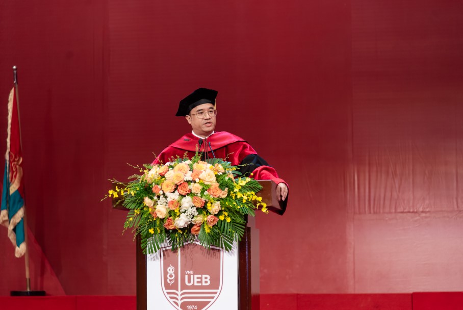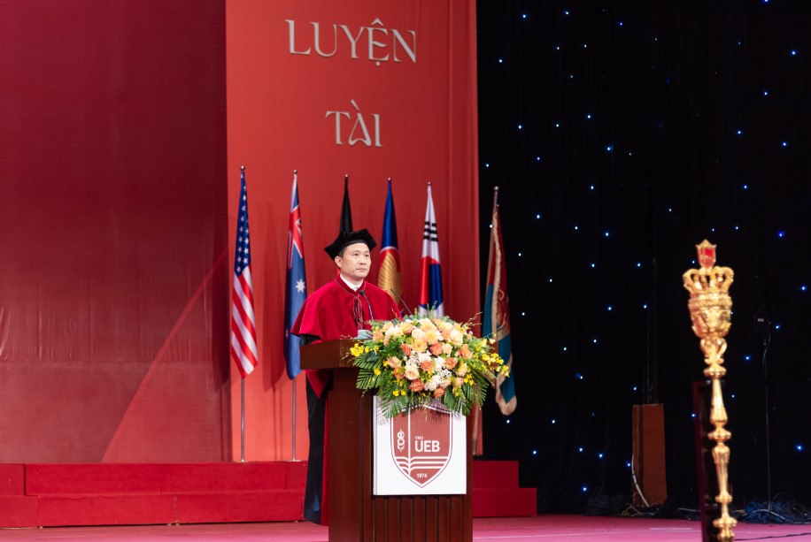 “Ngày hôm nay vô cùng đặc biệt đối với các em cử nhân, các anh/chị học viên tiến sĩ, thạc sĩ UEB. Những “trái chín” mà các bạn có hôm nay đã được các thầy cô nuôi dưỡng, chăm chút bằng những giờ học kỷ luật, bằng những bài tập tưởng chừng chỉ muốn bỏ dở. Nhưng chúng ta đã vượt qua tất cả. Đứng trước những thách thức mới, các bạn hãy tiếp tục phấn đấu, không ngừng học hỏi, và luôn giữ tinh thần mãnh mẽ và quyết tâm trong mọi hoạt động, không ngại khó khăn, sẵn sàng cống hiến cho cộng đồng và tổ quốc. Mỗi sinh viên, học viên và nghiên cứu sinh của Trường Đại học Kinh tế, dù ở bất kỳ vị trí nào, thực hiện bất kỳ công việc gì và ở bất kỳ đâu, hãy luôn nhớ rằng bạn là một phần không thể thiếu trong đại gia đình của Trường Đại học Kinh tế. Cánh cửa của UEB luôn mở rộng chào đón bạn quay trở lại, để tiếp tục con đường học vấn và mở ra cơ hội hợp tác mới với nhà trường.