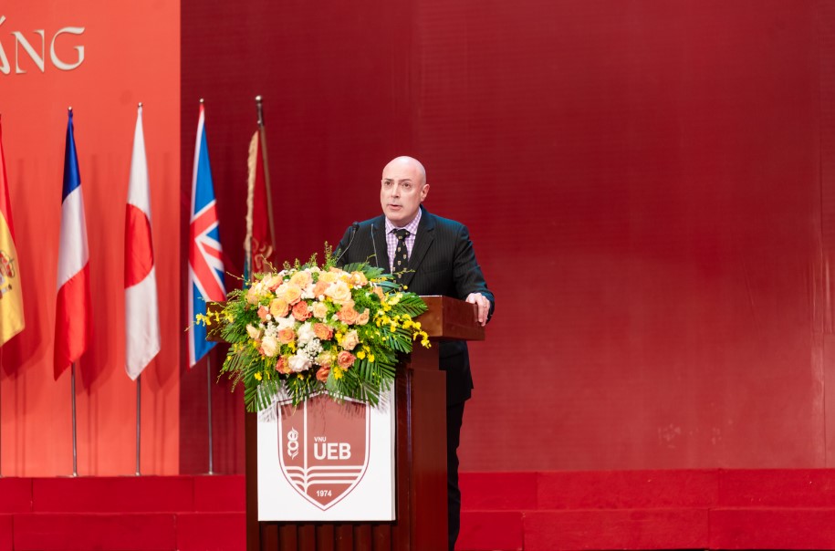 Tại buổi lễ, ông Steven Derek Brown, Phó Chủ tịch Hiệp hội doanh nghiệp Anh Quốc tại Việt Nam đánh giá cao tinh thần hợp tác toàn diện giữa nhà trường và doanh nghiệp. Ông gửi lời chúc mừng tới hơn 1 nghìn tân tiến sĩ, thạc sĩ và cử nhân nhận bằng ngày hôm nay. Trường ĐH Kinh tế là một ngôi nhà học tập nổi tiếng và được đánh giá cao trong nước và quốc tế. Và mỗi bạn nên cảm thấy tự hào đã đến ngày này trên con đường giáo dục của mình và chúng ta cùng tin tưởng các bạn tốt nghiệp hôm nay sẽ là đội ngũ nhân lực chất lượng cao, có nhiều đóng góp cho quốc gia phát triển bền vững hơn nữa.
