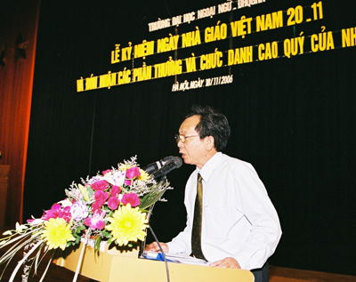 Sáng ngày 18/11/2006, tại hội trường 10-12 ĐHQGHN, Trường Đại học Ngoại ngữ đã long trọng tổ chức mít tinh chào mừng Ngày Nhà giáo Việt Nam 20/11. Tham dự có GS.TSKH Đào Trọng Thi - Giám đốc Đại học Quốc gia Hà Nội; đại diện lãnh đạo các ban chức năng, Đảng uỷ, Ban giám hiệu Trường Đại học Ngoại ngữ cùng toàn thể cán bộ, giáo viên, đại biểu sinh viên của nhà trường.