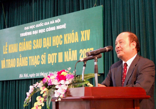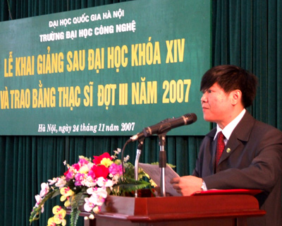 GS.TS Nguyễn Hữu Đức đã chúc mừng các tân học viên và tân nghiên cứu sinh và tuyên bố khai giảng khóa đào tạo sau đại học. GS Hiệu trưởng cũng thông tin tới các học viên và nghiên cứu sinh khóa XIV về chương trình đào tạo theo chuẩn quốc tế theo đề án 16/23 của Nhà trường mới được ĐHQGHN phê duyệt thực hiện.