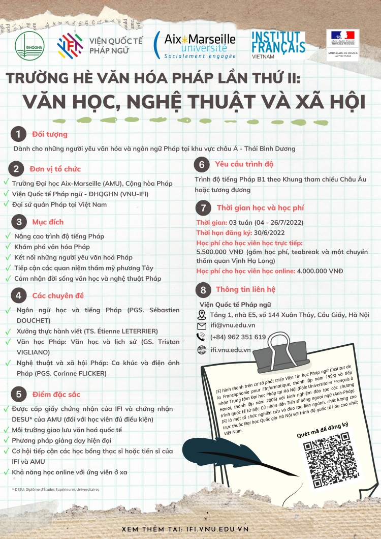 Viện Quốc tế Pháp ngữ - Đại học Quốc gia Hà Nội (VNU-IFI), Đại học Aix-Marseille (AMU) - Cộng hòa Pháp, Viện Pháp tại Việt Nam (IFV) và Đại sứ quán Pháp tại Việt Nam thông báo tuyển sinh Trường hè quốc tế năm 2022 với chủ đề “Khám phá Văn hóa Pháp”.