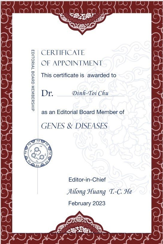 Vừa qua, anh được mời làm thành viên Ban biên tập tạp chí Genes & Diseases - một tạp chí quốc tế uy tín Q1 của nhà xuất bản Elsevier về Y học phân tử và Y học tịnh tiến. Anh có thể giới thiệu qua về tạp chí này cũng như dự định sắp tới của anh trên cương vị là thành viên Ban biên tập?