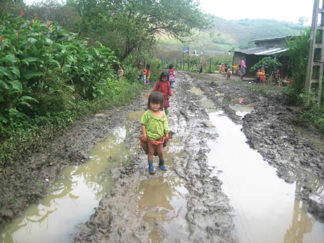 Chúng tôi về bản Phiêng Cành vào một ngày gần cuối tháng 9 khi những cơn mưa vừa ngớt hạt. Để có thể đến được “trường học” nơi đây, tôi cùng ông trưởng bản Tráng A Cơ phải mang ủng đi qua quãng đường dài lầy lội, nhớp nháp bùn lầy.