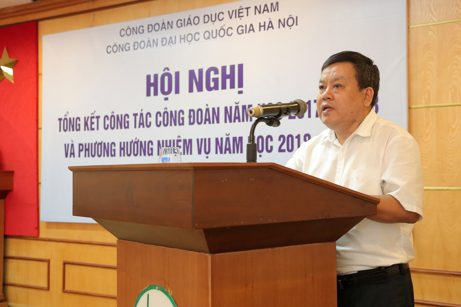 Đồng chí Vũ Minh Đức, đại diện công đoàn Giáo dục Việt Nam biểu dương ĐHQGHN, những thành tíchvượt trội trong năm qua. Năm học 2018 - 2019 là năm đầu tiên thực hiện Nghị quyết Đại hội XII Công đoàn Việt Nam, Đại hội XV CĐGD Việt Nam và tiếp tục thực hiện nghị quyết Đại hội V Công đoàn ĐHQGHN; năm học ngành Giáo dục và ĐHQGHN có những đổi mới quan trọng về quy mô, chương trình giáo dục, đổi mới cơ chế quản lý các cấp; phát huy những kết quả đạt được, khắc phục tồn tại, hạn chế của năm học trước.