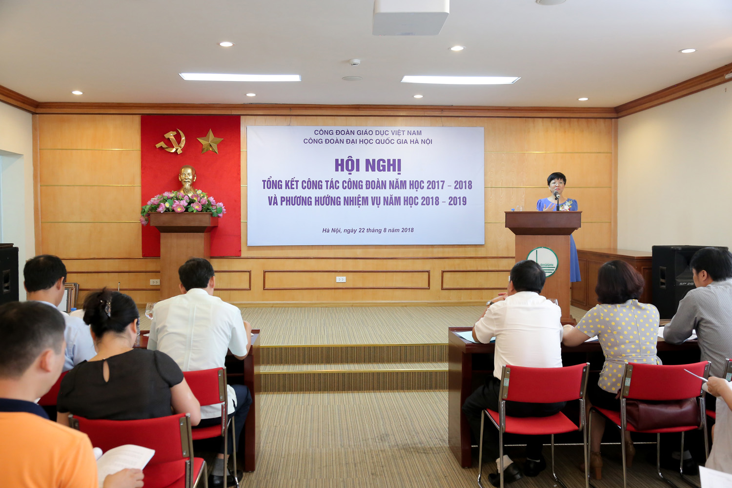 Đồng chí Nguyễn Thị Thảo, Phó Chủ tịch Công đoàn ĐHQGHN báo cáo tổng kết năm học 2017-2018 và phương hướng hoạt động 2018-2019