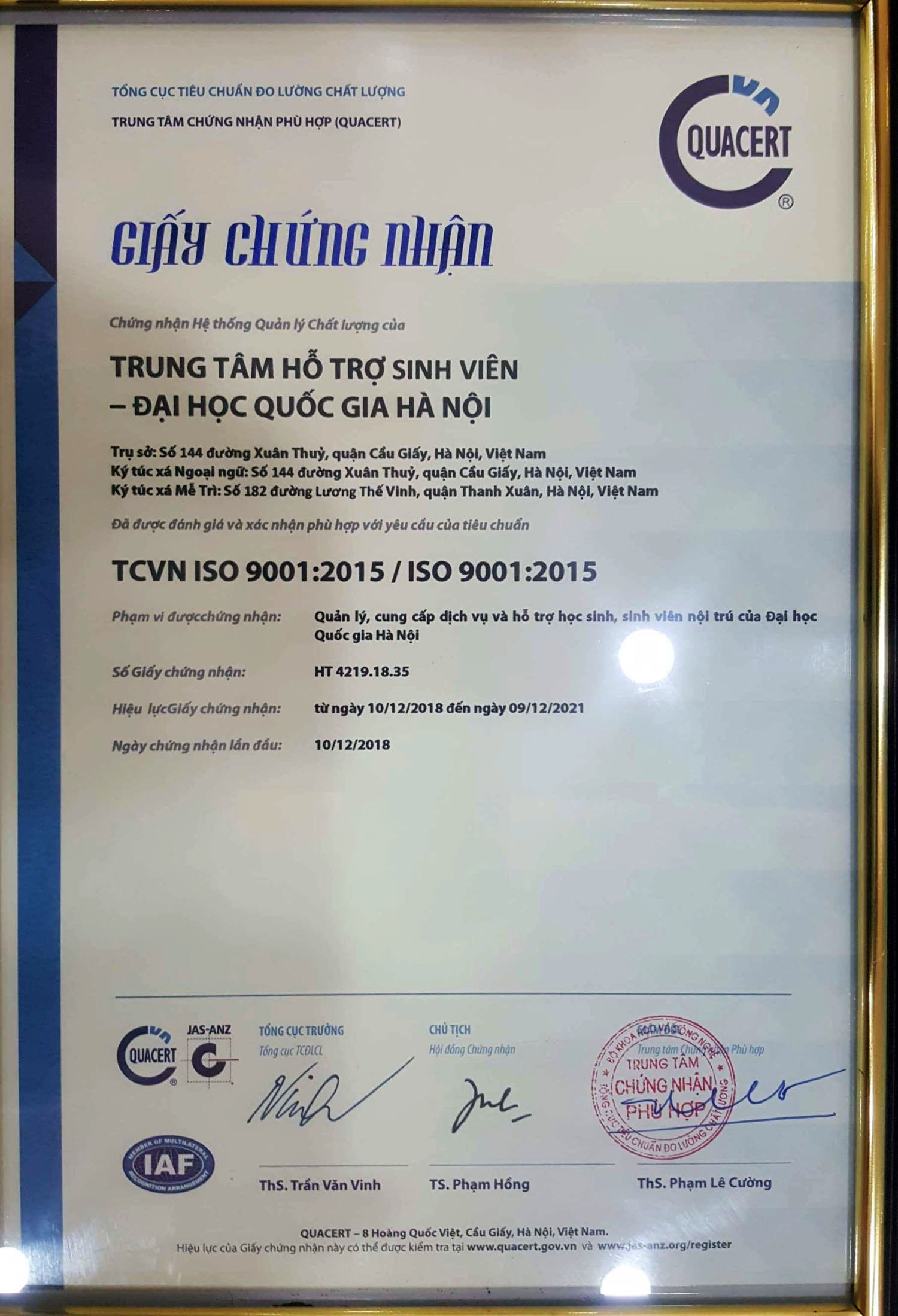 Tại Hội nghị, ông Trần Quốc Dũng - Phó Giám đốc Trung tâm QUACERT đã trao Giấy chứng nhận phù hợp tiêu chuẩn ISO 9001:2015 cho Trung tâm Hỗ trợ sinh viên.