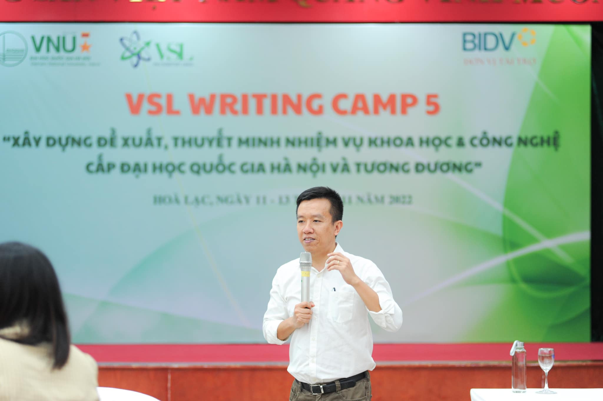 Chia sẻ tại chương trình, PGS.TS. Vũ Văn Tích đánh giá cao các hoạt động do CLB Nhà Khoa học ĐHQGHN tổ chức trong thời gian gần đây, đặc biệt VSL- Writing Camp là hoạt động thiết thực, bổ ích, không chỉ giúp các nhà khoa học nâng cao năng lực mà còn tạo sự kết nối của các nhà khoa học trong toàn ĐHQGHN; từ đó có thể thúc đẩy, kết nối những ý tưởng liên ngành, xuyên đơn vị. Ông cũng giới thiệu về cách viết đề cương đề tài cấp ĐHQGHN. Ông lưu ý các quy trình về xét duyệt nhiệm vụ KHCN hàng năm cũng như trao đổi những vướng mắc đối với các nhà khoa học trong thủ tục hành chính đến quá trình hình thành, hiện thực ý tưởng và cách triển khai, cách thức viết đề xuất nhiệm vụ khoa học công nghệ của ĐHQGHN cũng như cấp bộ/ngành/địa phương.