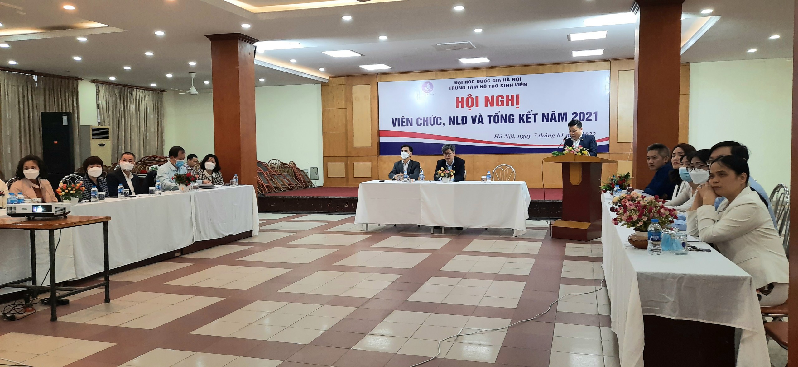 Tại hội nghị, Giám đốc Trung tâm Hỗ trợ sinh viên Hoàng Trọng Nghĩa cho biết, năm 2021, dịch bệnh Covid-19 kéo dài trong nhiều tháng, các đơn vị đào tạo tổ chức học online, vì vậy chỉ có khoảng 12% sinh viên lưu trú tại các ký túc xá. Giám đốc Trung tâm đã điểm qua một số kết quả thực hiện nhiệm vụ năm 2021 như: Triển khai nhiều biện pháp phòng chống dịch bệnh, giữ vững tình hình an ninh chính trị, an ninh trật tự trong các ký túc xá để học sinh, sinh viên nội trú được đảm bảo môi trường sống an toàn, lành mạnh; Đời sống vật chất, tinh thần của học sinh, sinh viên được quan tâm, đặc biệt là học sinh, sinh viên có hoàn cảnh khó khăn, khuyết tật; Thành lập Văn phòng Hỗ trợ sinh viên quốc tế nhằm tiếp nhận và điều phối các vấn đề liên quan đến sinh viên quốc tế đang học tập, nghiên cứu tại ĐHQGHN; Lần đầu tiên triển khai đăng ký nội trú bằng hình thức trực tuyến…