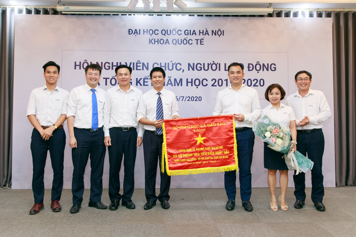 Phó Giám đốc ĐHQGHN Phạm Bảo Sơn trao Cờ thi đua của Bộ GD&ĐT cho Khoa Quốc tế vì thành tích trong phong trào thi đua "Đổi mới, sáng tạo trong dạy và học"