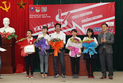 BTC trao giải cho các đội thi. F&B (đứng giữa) xứng đáng nhận giải Nhất SV Tài chính 2013. Giải Nhì thuộc về A Team (đứng thứ 3 từ phải sang) - đội thi mang lại nhiều tiếng cười nhất cho cuộc thi. Giải Ba thuộc về Friendly Acountants (đứng thứ 2 từ trái sang); 2 giải Khuyến khích thuộc về K57 Team (ngoài cùng bên trái) và Crazy Team