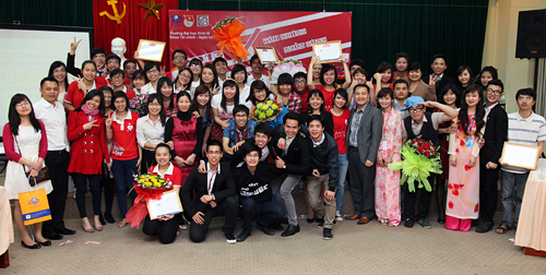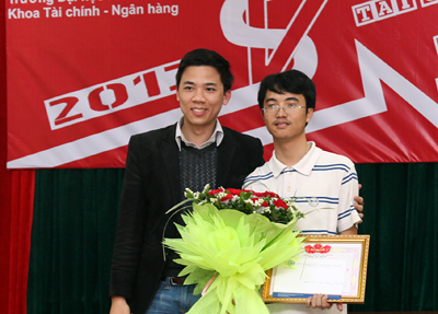 F&B cũng là đội giải Nhất cho clip giới thiệu có số lượng người "like" nhiều nhất trên Youtube. Ảnh: Anh Nguyễn Trung Phong - Phó Bí thư Đoàn thanh niên ĐHKT trao thưởng cho đội đọat giải.