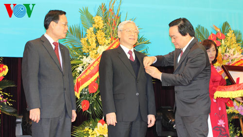 Lãnh đạo ĐHQGHN tặng hoa Tổng Bí thư Nguyễn Phú Trọng